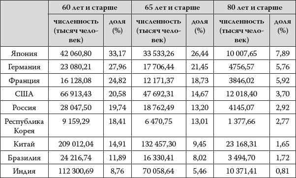 Табл. 1.1. Численность пожилого населения и ее доля в общем населениидевяти стран, в том числе Китая, по состоянию на 2015 год