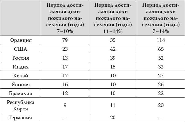 Табл. 1.3. Период, необходимый для достижения определенной доли пожилых людей в общем населении девяти стран