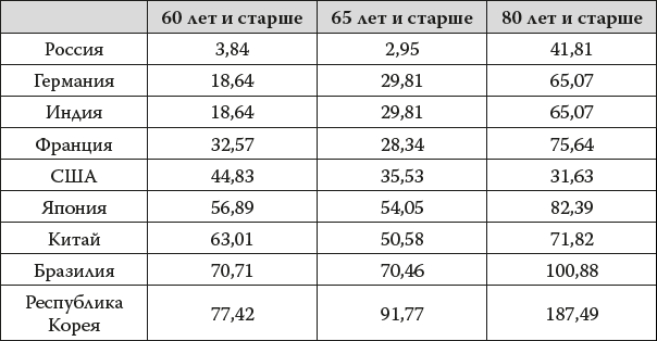 Темпы увеличения численности пожилого населения в различных возрастных группах за пятнадцать лет – с 2000 по 2015 год – отражены в табл. 1.4. В этот период резко увеличилось количество людей 60 лет и старше. Среди выбранных девяти стран по темпам роста этого показателя Китай (63,01 %) уступает только Бразилии (70,71 %) и Республике Корея (77,42 %). Аналогичная тенденция наблюдается и в возрастной группе 65 лет и старше. Китай здесь занимает четвертое место. Пожилое население КНР за пятнадцать лет заметно возросло, однако темпы этого роста не ускоренные.