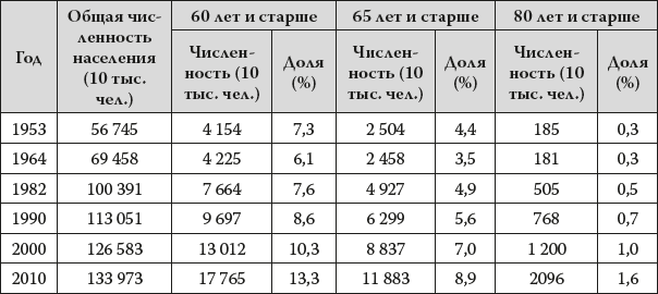 По данным переписей населения, доля людей 60 лет и старше в общем населении Китая увеличилась с 6,1 % в 1964 году до 13,3 % в 2010 году. По результатам шестой переписи населения 2010 года, в материковом Китае (за исключением Гонконга, Макао и Тайваня) насчитывалось 177,65 млн чел. 60 лет и старше – 13,3 % от общей численности, а 65 лет и старше (8,9 %) – 118,83 млн чел. Общая численность населения материкового Китая в 2010 году – 1,34 млрд чел. Показатели представленных возрастных групп увеличились на 3 и 1,9 процентного пункта соответственно по сравнению с 2000 годом и на 6 и 4,5 – по сравнению с результатами первой переписи 1953 года. Примерно за последние шестьдесят лет как число, так и доля пожилых людей в общем населении Китая увеличивались ускоренными темпами. В особенности это касается периода с 2000 по 2010 год. Это значительно выше разницы значений, зафиксированных в ранних переписях. Тенденции старения населения Китая в это десятилетие развивались стремительно (табл. 1.5).