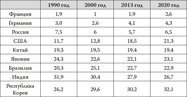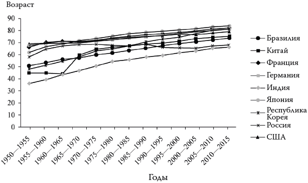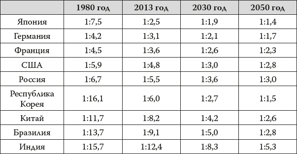 Источник: доклад ООН «Старение мирового населения – 1950–2050»Данные по Франции, Германии, Японии и США отсутствуют. – Примеч. авт.