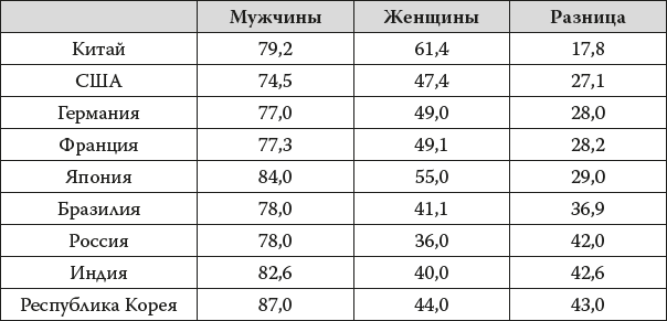 На пребывание в браке пожилых людей также влияют сформировавшиеся в молодости личные обстоятельства и социально-семейное положение. В Китае разница между долями состоящих в браке пожилых мужчин и женщин минимальна (17,8 %). Это связано с тем, что женщины данной возрастной группы в Китае заметно чаще состоят в браке, чем пожилые женщины в других странах (64,1 %). Самая большая разница по этому показателю между мужчинами и женщинами – в Республике Корея (43 %) (табл. 1.8).