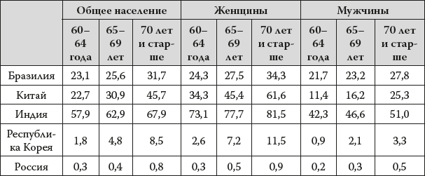 Табл. 1.9. Показатели безграмотности пожилого населения в пяти странах, в том числе Китае, за 2010 г.