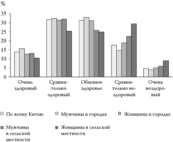 Большинство пожилых людей полагают, что они относятся к группе здоровых людей. Более 77 % считают себя физически здоровыми – как «очень», так и «сравнительно». Не очень и сравнительно нездоровы – 17,78 %, а 4,95 % пожилых людей очень нездоровы. Пожилые люди в городах оценивают состояние здоровья выше, чем их ровесники в сельской местности. Пожилые мужчины лучшего мнения о своем здоровье, чем женщины. Женщины и мужчины из сельской местности оценивают себя как «сравнительно нездоровых» и «очень нездоровых» в 40 и 28,54 % случаев соответственно. Для пожилых женщин и мужчин в городах эти показатели составляют 24,19 и 18,78 % (рис. 2.1).