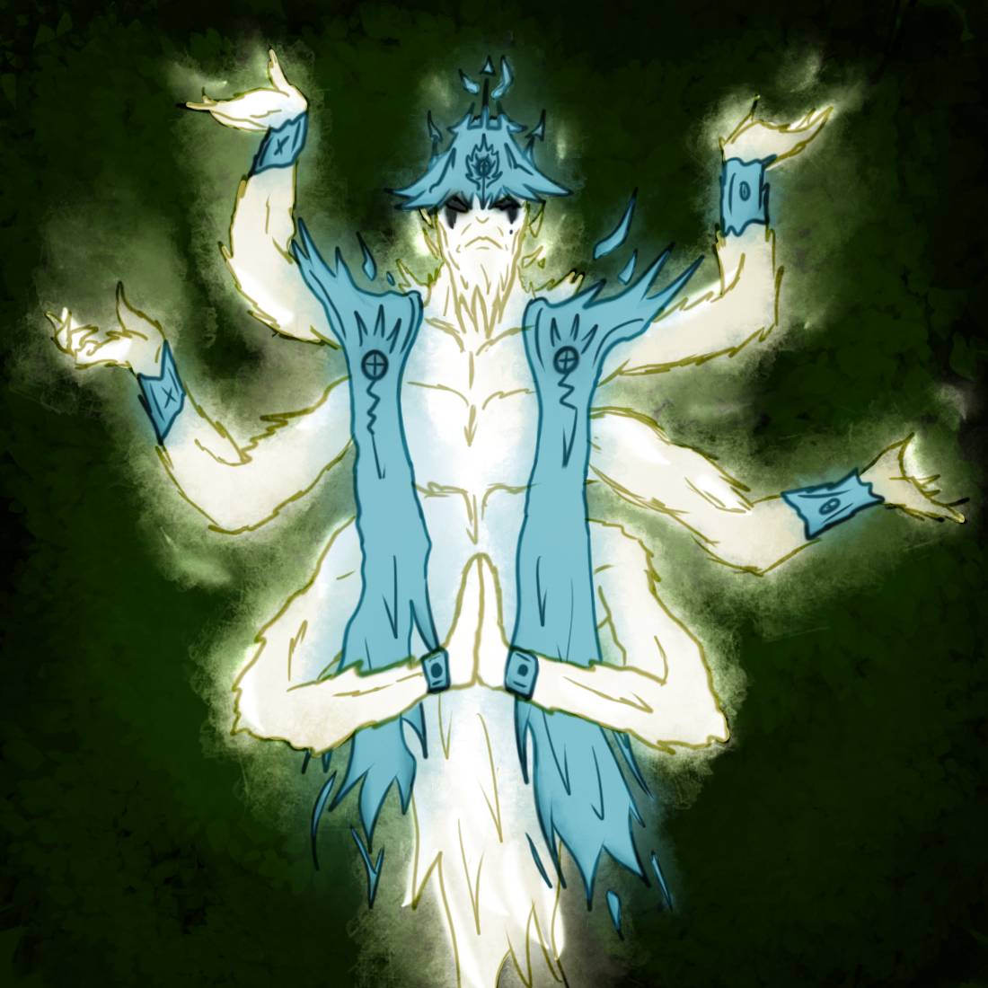 – В твоих силах видеть меня – что удивительно, однако слышишь ли ты мой голос, дитя? – сказал он, еле двигая призрачными губами, после чего раздвинул нижнюю пару рук и раскрыл ладони, что тянулись к собеседнику жёлтыми огнями.