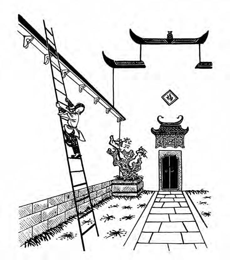Художник со слугами бросился обыскивать двор. Ма Лян действительно не успел ускользнуть. На одной из стен он рисовал лестницу. Стена была высокой, и он, поднимаясь по ступенькам, рисовал новые одну за другой. Когда его нашли слуги богача, он уже сидел на стене.