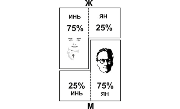 Итак, возьмём условно «идеальную женщину». Баланс Инь/Ян в ней должен соотноситься, как 75% к 25%. Однако для реализации ей надо поддерживать его на уровне 50/50. Где взять недостающие янские 25%, и куда деть лишние 25% иньских? Конечно же, варианты здесь есть, но самый естественный – найти мужчину с соотношением Инь/Ян как 25/75! И поскольку эта пропорция у каждого человека своя, естественно рождается подсознательное стремление к своему строго индивидуальному идеалу (Рис. 03).