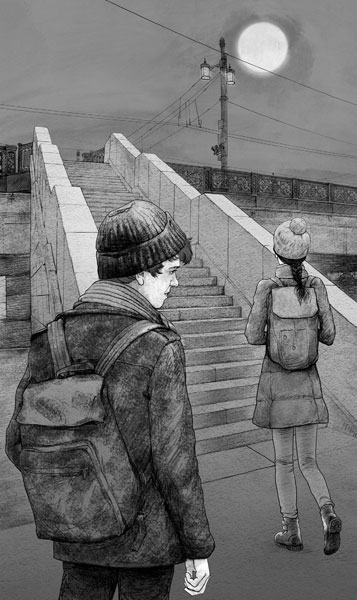 Но Федя не расслышала его, она как будто переместилась, не сделав и шага, и оказалась на мосту – он все еще видел ее парящий силуэт. Тогда Кирилл кинулся следом, но расстояние до моста только увеличивалось, как во сне. Ему сделалось жутко. Он схватил мобильник. Федин телефон был вне зоны доступа, хотя он все еще видел ее силуэт, точно бы парящий в воздухе. Тогда Кирилл прыгнул. Он приземлился в самом начале моста, но Федя уже растворилась в тумане, а мост будто бы дрогнул и начал раздваиваться: одна его часть ушла вниз, а Кирилл остался на той, что была выше. Или это он сам дрожал от возбуждения и тревожного предчувствия?.. Он прочно стоял обеими ногами на плите, покрытой асфальтом, и не решался сделать следующий шаг.