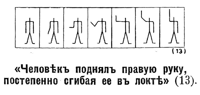 Фигуры этого «ручного языка» связываются между собой в кинематографическую последовательность, в которой любой ход движений и любые изменения состояния одновременно и представимы, и отображаемы (см. ил. 5).