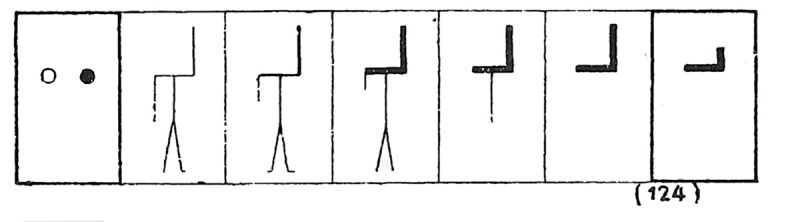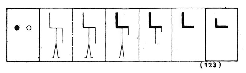 Производя детальные расчеты, Линцбах доказывает, что эта форма изложения не будет ни более затратной, ни более трудной, нежели обычное вербальное описание. Так, например, для передачи на письме сцены, в которой человек поднял руку и согнул ее, потребуется записать последовательность слов, а для осуществления этой записи нужно будет 9 × 16 = 144 раза приложить перо к бумаге, в то время как кинематографическое черчение этого же процесса потребует проведения 7 × 8 = 56 линий, причем их число можно уменьшить, если просто указать начальную и конечную позиции последовательности движений, возможно с помощью связывающей срединной фигуры или же посредством интеграции метонимических элементов движения (см. ил. 6–8).