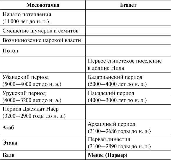 Но более жаркий и сухой климат, который пришел на Месопотамскую равнину, иссушил также и Сахару. Люди из Сахары ушли на восток, к хорошо увлажняемой долине Нила. Благодаря тому, что количество дождей уменьшилось, разливы Нила стали более терпимыми; переселенцы обнаружили, что могут справляться с ежегодными паводками, выкопав резервуары, чтобы удерживать воду, пришедшую с разливом, и каналы, чтобы орошать свои поля в более сухие месяцы. Люди строили на берегах поселки, сажали зерно в черный ил, остававшийся после наводнений, и охотились на дикую живность болот: диких быков, гиппопотамов, крокодилов и птиц, а также ловили рыбу. Постепенно к ним присоединились другие люди, прибывшие с западных берегов Красного моря. Они стали первыми постоянными обитателями долины Нила – первыми египтянами[13].