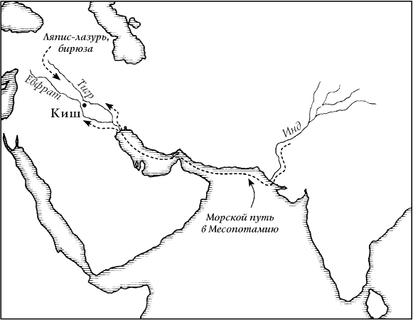 Города Месопотамии были независимыми, во главе каждого стоял местный правитель. Но расположение в междуречье Киша стало толчком к утверждению превосходства этого города над остальными. В конце концов, в Шумере не было своего леса – здесь в небольших количествах росли только завезенные пальмы, являющие собой третьесортный строительный материал. Здесь не было камня, не было меди, не было обсидиана – не было ничего, кроме ила, глины, а также нескольких месторождений битума или асфальта, использующегося как масло в светильниках или как связующий материал в строительном растворе. Дерево нужно было доставлять с северо-востока, с гор Загрос, или же привозить с Ливанских гор, расположенных на северо-западе. Медь прибывала с южных Аравийских гор, ляпис-лазурь – из скалистых земель на севере и востоке; камень доставляли из пустыни на западе, а обсидиан – с далекого севера. В обмен шумерские города могли предложить сельскохозяйственные товары: зерно, одежду, кожу, гончарные изделия. Шумерские горшки и сосуды широко использовались и в маленьких поселках, и в городах по всей Восточной Европе и Северной Азии.