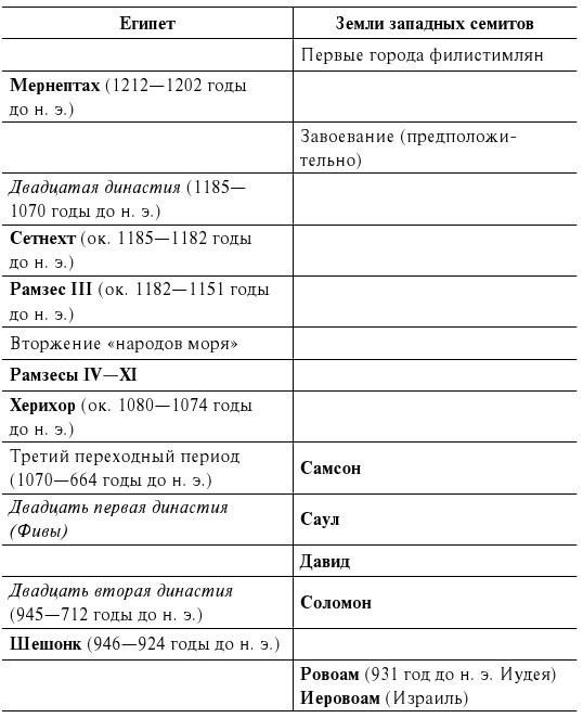 «Я ненавижу его подарки,и мне наплевать на него.Пусть предлагает и десять, и двадцать раз что угодно…Пусть обещает хоть все сокровища… Фив египетских,богатейшего города в мире во всем, как известно,потому что имеет сто врат и через каждые двести мужчинвъехать могут на колесницах и лошадях одновременно»[60].Фиванские жрецы использовали часть этих богатств, чтобы сохранять контроль над югом; они нанимали солдат из Ливии поддерживать их власть. Эти ливийские «полицейские силы» были известны как «Мешвеш»[61]. Примерно в 950 году до н. э. или около того «Великим начальником Мешвеш» стал ливиец по имени Шешонк, имевший собственные амбиции. Хотя он возглавлял полицию Севера, он смог также создать союз с Югом путем женитьбы на одной из дочерей правившего в Танисе фараона Псусеннеса II, о четырнадцатилетнем царствовании которого нам почти ничего не известно. Когда Псусеннес II умер, Шешонк благодаря этой женитьбе унаследовал его право на трон Египта в Танисе. Так как к этому времени он достиг выдающегося положения, став главной опорой власти жрецов в Фивах, теперь у него не заняло много времени утвердить свою власть и над второй столицей Египта.