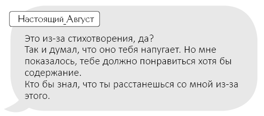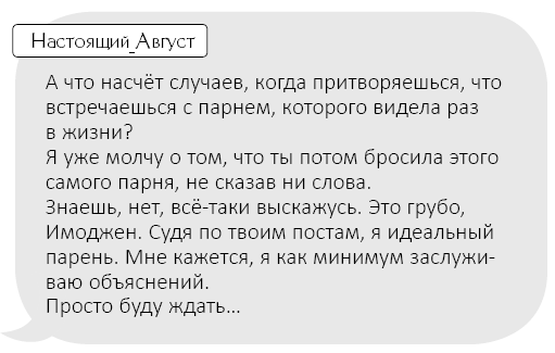 Кто-то просто использовал его имя, чтобы заставить меня признаться. С этим я могла справиться. Предполагать, что это был всамделишный Август, который расстроился из-за нашего разрыва вместо того, чтобы разозлиться? Я на это и не надеялась.