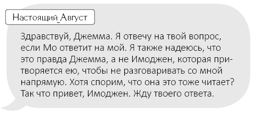 Я невольно посмотрела на сообщения от Настоящего Августа. После общения с Джеммой он не писал мне несколько дней. Оставалось лишь надеяться, что новости о моей влюблённости в другого парня были для него знаком, что я хочу двигаться дальше, и ему стоило сделать то же самое.