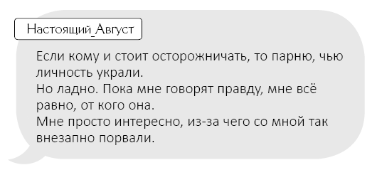 Через несколько минут мне написал некто под ником Настоящий_Август. Мой пост провисел достаточно долго, чтобы кто-то мог успеть создать фальшивый аккаунт.