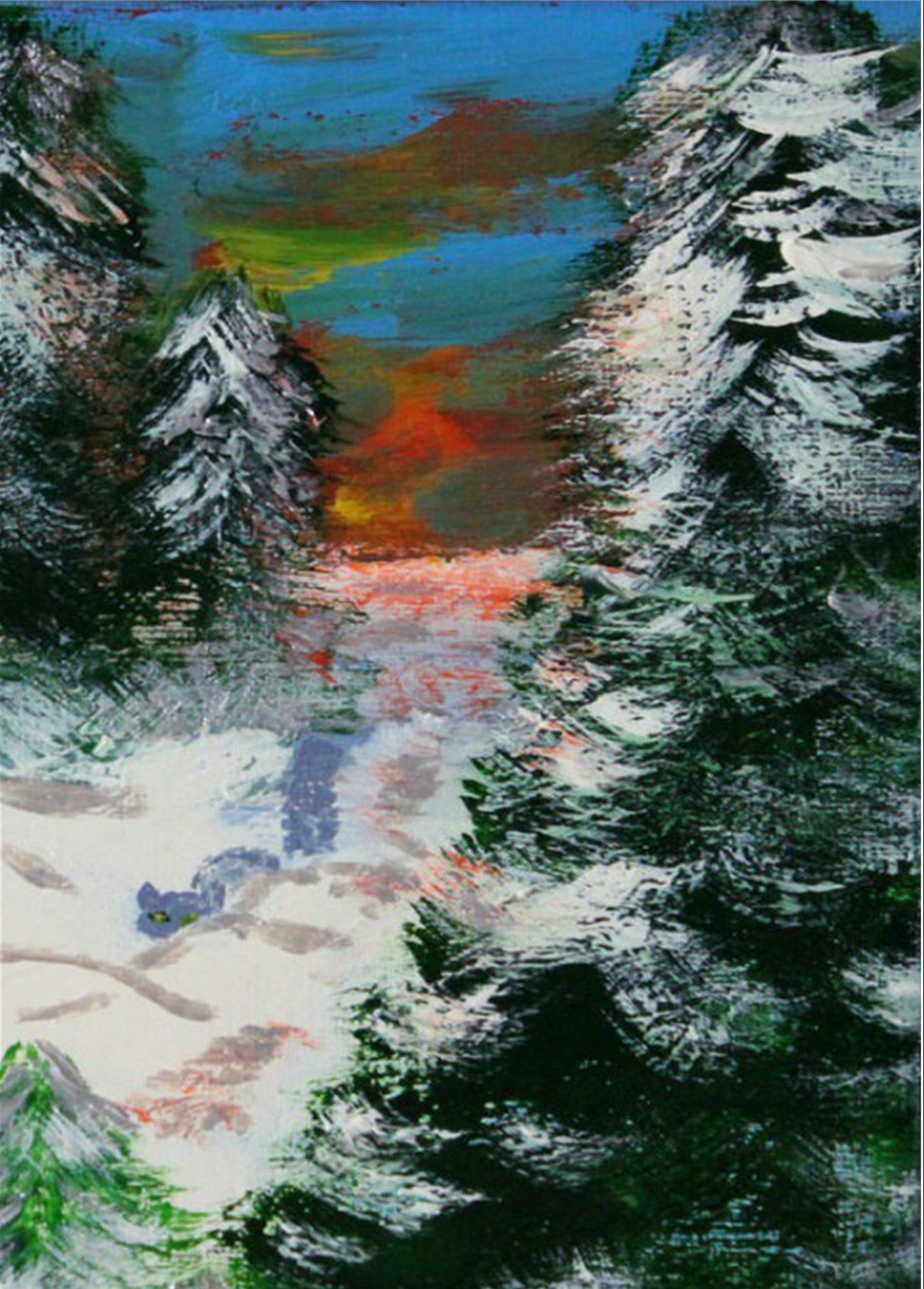 Дремучий лес стоял задумчиво в снегу. Пролетел мороз. Своей косматой бородой коснулся деревьев, и они застыли со сказочно красивыми узорами на ветвях. Поднялось солнышко, но даже оно не смогло прогреть медленно просыпающийся лес. В дупле старого дерева жила семья белочки Кайсы. Она открыла окошко и выглянула из него. Все вокруг дышало холодом.