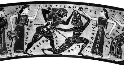Третий способ идентифицировать миф – изобразить героя, сражающегося с уникальным, ни на кого не похожим противником. Подойдет любое диковинное существо, будь то многоголовая гидра, птица с человеческой головой или быкоголовый мужчина.