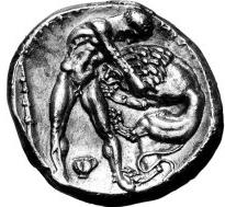 Тема схватки Геракла с Немейским львом привлекала и мастеров, работавших с другими изобразительными средствами. Например, на серебряной монете IV века до н. э. из Гераклеи в Лукании на юге Италии (ил. 15) Геракл как будто состязается со львом в единоборстве. Он поймал льва в шейный захват, как делают борцы, тем самым у схватки возникает антропоморфный подтекст, всё больше набиравший популярность. Палица Геракла опирается в левую грань монеты, размерами она с дубинку, которая ассоциируется скорее с атрибутом Тесея (см. ил. 11). В сценах сражения с Немейским львом на Геракле, как правило, нет львиной шкуры, потому что она еще на звере, – но иногда по рассеянности художник, привыкший видеть героя, облаченным в львиную шкуру, упускал нить сюжета. Этот тип батального сюжета был чрезвычайно популярен с середины V века до н. э. и воспроизводился в малой бронзовой и большой мраморной скульптурах, а также на резных мраморных саркофагах, которые римляне часто украшали сценами из мифов.