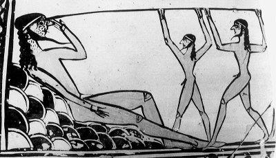 В данном случае человек – это Одиссей, многострадальный герой гомеровской Одиссеи. Его можно узнать по походному шлему (пилосу), ставшему чем-то вроде фирменного знака Одиссея, но гораздо красноречивей его положение. Причина столь своеобразной позиции в следующем.