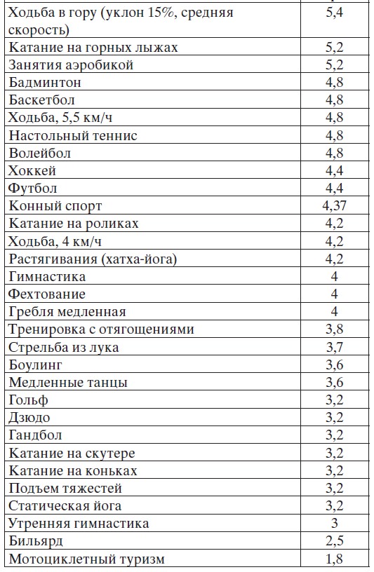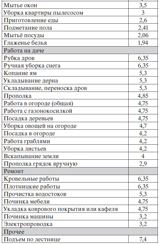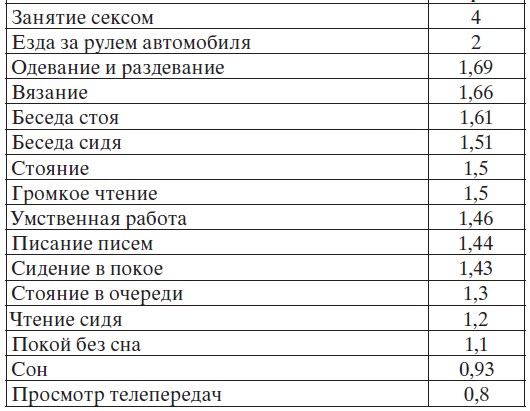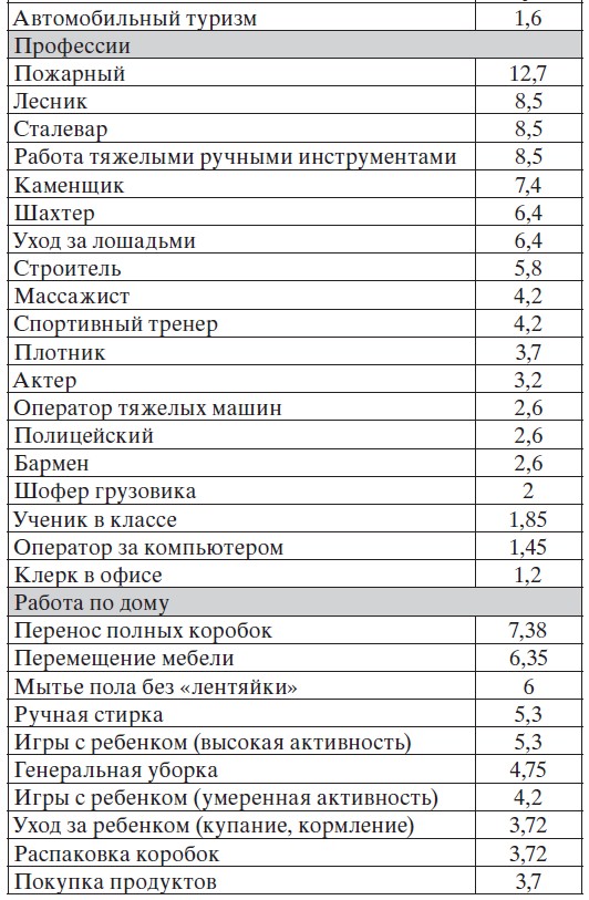 Энергозатраты можно рассчитать по следующей таблице, где указаны расходы энергии (в килокалориях) за час деятельности на 1 кг веса. То есть ваш вес вы должны умножить на эту цифру и тогда узнаете, сколько энергии потеряете за час, занимаясь какой-либо деятельностью.