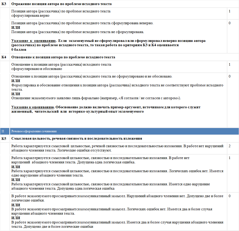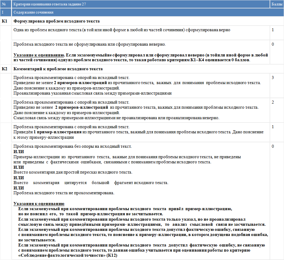 Если сочинение представляет собой полностью переписанный или пересказанный исходный текст без каких бы то ни было комментариев, то такая работа по всем аспектам проверки (К1–К12) оценивается 0 баллов.