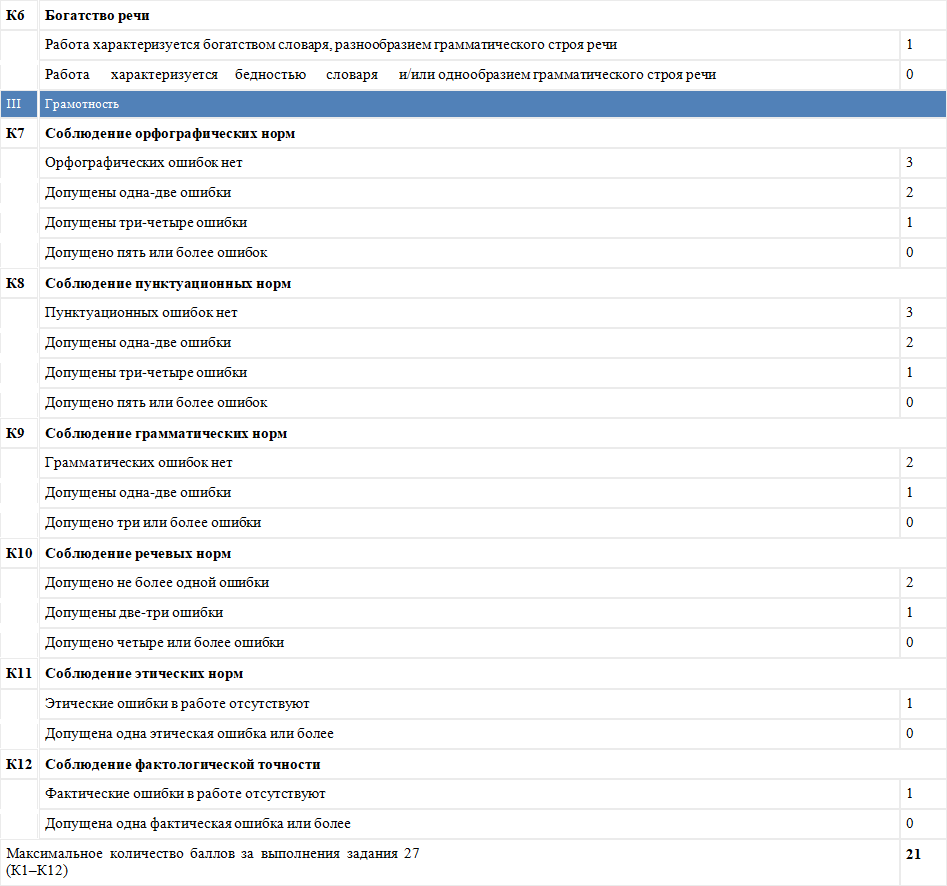 При оценке грамотности (К7–К10) следует учитывать объём сочинения. Указанные в таблице нормы оценивания разработаны для сочинения объёмом 150 и более слов.
