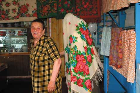 Лидия Павловна Левкина (1932 г. р., уроженка д. Олема) показывает, как ее, покрытую фаткой, во время просватания водил по избе дядя. Жених Лидии Павловны, увидев «такую дикость», чуть не сбежал. Фото Е. Беляевой. Июль 2010 г. Деревня Кеба Лешуконского района Архангельской области