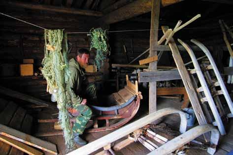 Виктор Иванович Нечаев (1956 г. р., уроженец с. Жердь) на повети своего дома, где оборудовал мастерскую по изготовлению саней и пошевней. Фото И. Веселовой. Июль 2009 г. Село Жердь Мезенского района Архангельской области
