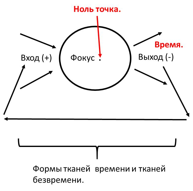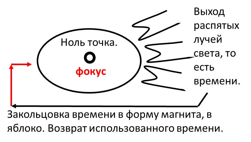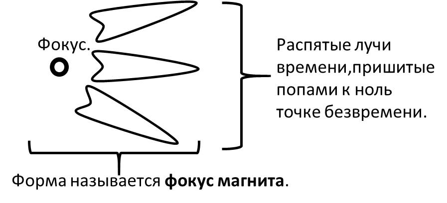 Безвремя своей неподвижностью являет форму тела, которая в магните называется фокусом. Как и из чего является форма фокуса? Так как безвремя нельзя увидеть, то форму безвремени можно увидеть только с помощью лучей времени. Для этого надо распять время на лучи и выложить их головками от ноль точки и концами к ноль точке так как показано на рисунке: