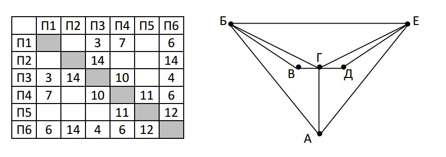 Так как таблицу и схему рисовали независимо друг от друга, то нумерация населённых пунктов в таблице никак не связана с буквенными обозначениями на графе. Сколько самых коротких дорог ведет из пункта Б в пункт Е?