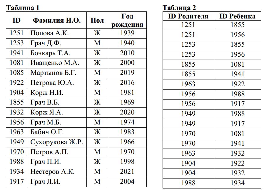 Ниже представлены два фрагмента таблиц из базы данных о жителях микрорайона. Каждая строка таблицы 2 содержит информацию о ребёнке и об одном из его родителей. Информация представлена значением поля ID в соответствующей строке таблицы 1. На основании имеющихся данных найдите наибольшую разницу между годами рождения родных брата и сестры.