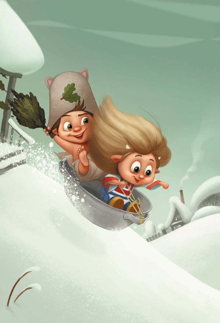 Веничкин ничего не ответил, лишь задорно махнул рукой, и они побежали кататься. Баневёнок привязал за ручку корыта верёвку и, как на санках, покатил Мохнатика к горе. У самого склона он разогнался, с разбегу оттолкнулся и запрыгнул в корыто! И они вместе с Мохнатиком понеслись вниз!