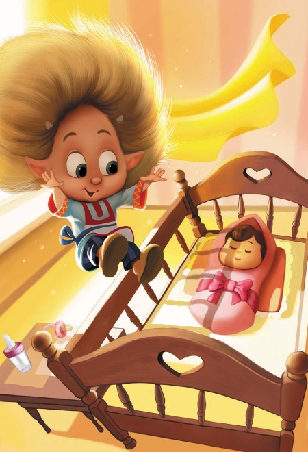 Мохнатик поправил тапти, подтянул шортики и опять полез на занавеску. Хр-хр-хрысь – раздался звук. Занавеска под весом домовёнка поползла вниз, но не оборвалась. Он залез ещё выше, раскачался и, вытянув ноги вперёд, как прыгнет! Оказался в кроватке и с нетерпением заглянул в свёрток.