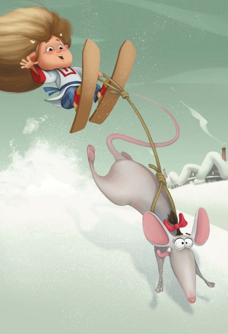 Выскочила крыса на улицу, а там снегу по пояс! Она всё равно бежит, всё ускользнуть от Мохнатика хочет! Надеялась, что в сугробах домовёнок не удержится да её отпустит. Не тут-то было! Домовёнок в два счёта выхватил из-за спины лыжи и надел их на тапти, за верёвку покрепче взялся да ещё ловчее поехал. Весело ему! Едет быстро на лыжах, крысу погоняет! Снег в разные стороны из-под лыж веером летит! А домовёнок то на бугорке подпрыгнет, то кувырок в воздухе сделает. Радуется! Веселится!