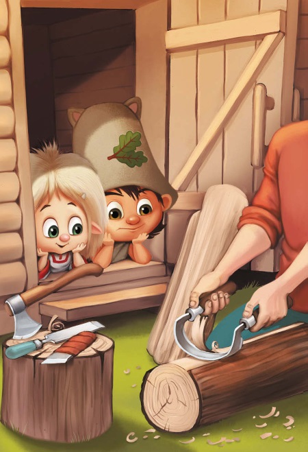Но баневёнок ничего ему не ответил – торопился. Он схватил только шкуродёрку – это инструмент такой, чтобы кору с деревьев снимать, – взял домовёнка за руку, и они побежали в лес.
