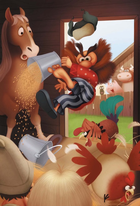 Пришли на двор. Он оказался очень большим: с огромной красной крышей, под которой был сеновал, забитый сеном; почти как настоящий дом со множеством загонов для лошадей и коров, курятником и специальным помещением, где Галоша отдыхал. На дворе было четыре коровы, пять породистых лошадей, овцы, бараны, свиньи с маленькими поросятами. Баневёнок и Мохнатик начали искать Галошу. Они ходили из одного загона в другой, даже на сеновал залезли и в кормовую, где Галоша хранил еду для всех животных. Но того нигде не было.