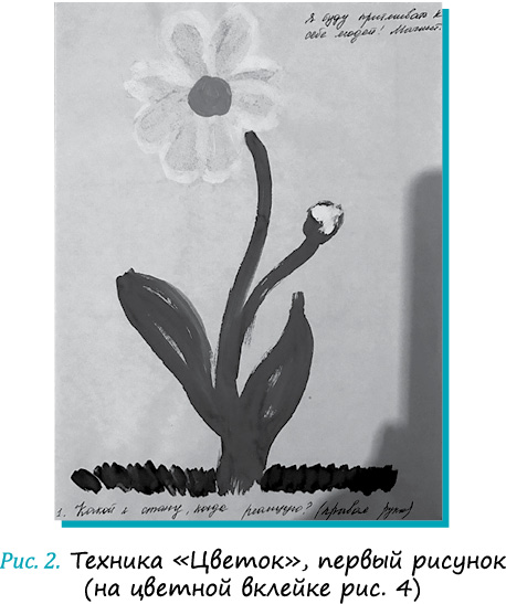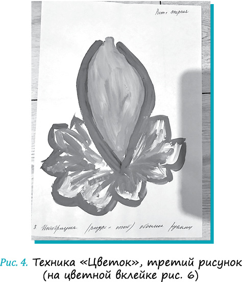 Рисунки 2 и 3 сюжетно связаны, благодаря чему становится ясно, что ресурсы, необходимые автору рисунка, интегрировались как энергия + опыт. Мы видим рост в динамике, поскольку бутон раскрывается. Однако на рисунке 4 не хватает источника жизненной силы для бутона. Я бы рекомендовала дорисовать ему стебель, воду, вазу или что-то, что могло бы стать источником витальной силы.