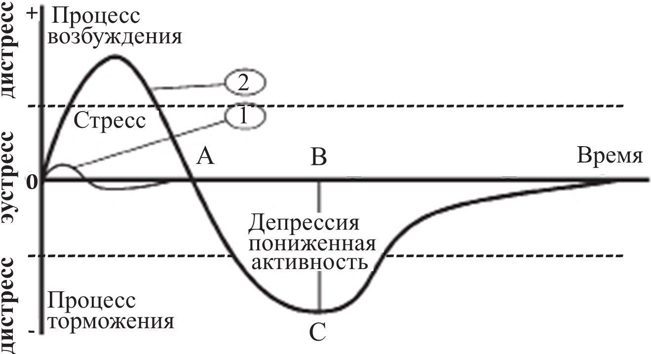 Кривая 1 отражает небольшой стресс, с которым мы встречаемся повседневно (эустресс). Кривая 2 отражает сильный стресс (дистресс).