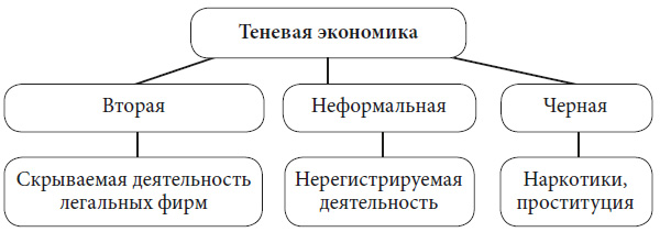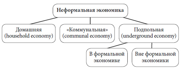 Например, известный британский социолог Дж. Гершуни[1] считает, что предельно общей категорией выступает «неформальная экономика», в которую входят домашняя, экономика взаимных услуг и подпольная экономика внутри как формальных, так и неформальных предприятий.