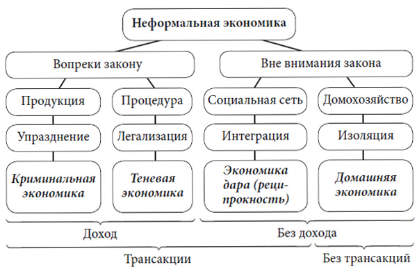 Ведь очевидно, что письменный контракт является далеко не единственным способом оформления хозяйственной практики. Экономическая жизнь может основываться на традиции, взаимопомощи, солидарности, доверии как специфических формах социальных отношений. Из этого следует вполне очевидное деление неформальной экономики на два качественно разнородных блока, редуцируемых до понятий «вне» и «вопреки».