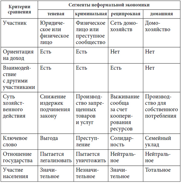 Таблица 1.1. Сравнение сегментов неформальной экономики