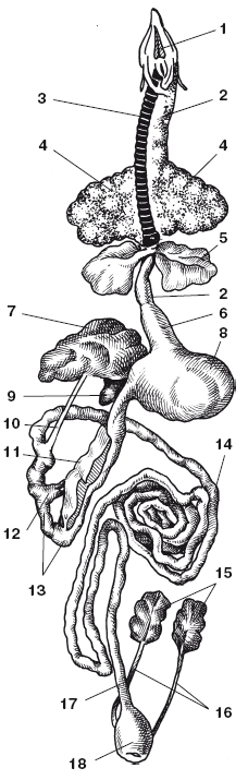 1 – язык; 2 – пищевод; 3 – трахея; 4 – зоб; 5 – легкие; 6 – железистый желудок; 7 – печень; 8 – мышечный желудок; 9 – селезенка; 10 – проток печени; 11 – поджелудочная железа; 12 – протоки поджелудочной железы; 13 – двенадцатиперстная кишка; 14 – тонкий кишечник; 15– почки; 16– мочеточник; 17 – прямая кишка; 18 – клоака