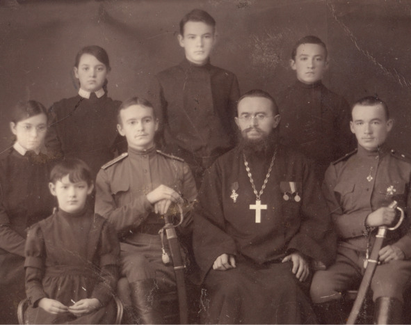 Стоят слева направо: Вера, Михаил, Иван. Сидят: Мария, Надежда, Сергей, о. Серапион, Василий. Город Яранск, 1916 год.