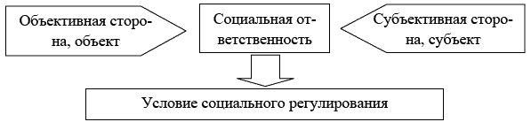Объективная необходимость в упорядочении и регулировании отношений между людьми, которая реализуется в должном поведении, аккумулирует содержание социальной ответственности. В структуру социальной ответственности входят такие элементы, как объективная и субъективная стороны, субъект и объект (рис. 1).