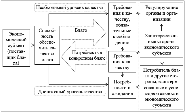 4) уровень качества экономического блага, и, соответственно, удовлетворенность заинтересованных в благе сторон зависит от степени выполнения экономическим субъектом двух групп требований к качеству: