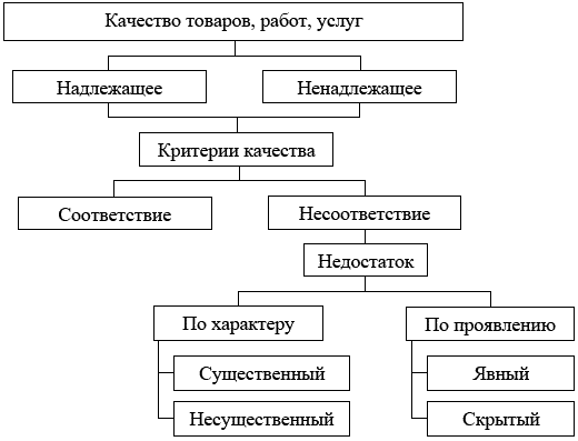 Но качество услуги по договору о возмездном оказании ГК РФ специально не регулируется по причине ее (услуги) неовеществленного содержания. По мнению законодателя (ст. 702, 730, 783 ГК РФ), качество оказываемой потребителю услуги должно регулироваться в соответствии с Законом о защите прав потребителей и иными правовыми актами, принятыми в соответствии с ним[4]. Преамбула этого Закона определяет два вида нарушения требований к качеству товаров, работ, услуг: недостаток товара, работы, услуги и существенный недостаток товара, работы, услуги. Недостаток товара (работы, услуги) есть несоответствие товара (работы, услуги) или обязательным требованиям, предусмотренным законом, либо в установленном им порядке, или условиям договора (при их отсутствии или неполноте условий обычно предъявляемым требованиям), или целям, для которых товар (работа, услуга) такого рода обычно используется, или целям, о которых продавец (исполнитель) был поставлен в известность потребителем при заключении договора, или образцу и (или) описанию при продаже товара по образцу и (или) по описанию. Существенным недостатком товара (работы, услуги) считается неустранимый недостаток или недостаток, который не может быть устранен без несоразмерных расходов или затрат времени, или выявляется неоднократно, или проявляется вновь после его устранения, или другие подобные недостатки. Практика обычно относит к существенным такие недостатки, при которых товар (работа, услуга) не может быть использован по назначению. В обоих случаях качество считается ненадлежащим. Ненадлежащее качество также выражается в виде явных и скрытых недостатков. Первый может быть обнаружен потребителем при обычном способе приемки товаров, результатов работ, т. е. при внешнем осмотре, изучении потребительских свойств товара (результатов работы). Скрытый же недостаток обычно проявляется через некоторое время после передачи потребителю товара (результата работы). Для его обнаружения в момент получения потребителем товара (результата работы) нужны специальные знания, а также применение специальных средств и методов приемки. Данная классификация имеет первостепенное значение в отношениях по выполнению работ и оказанию услуг (п. 3 ст. 29 Закона РФ «О защите прав потребителей») (рис. 3).
