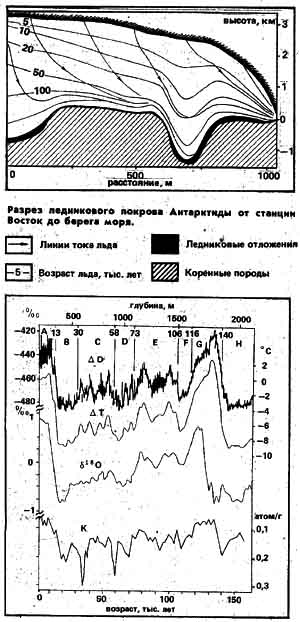 Исследования ледниковых кернов, добытых из скважин Антарктиды и Гренландии, позволяют определить длительность и окончание последнего ледникового периода.. На графике приведены результаты исследования ледниковых кернов на Российской станции Восток [В. М. Котляков "Глобальные изменения природы в «зеркале» ледяного керна", 1992].