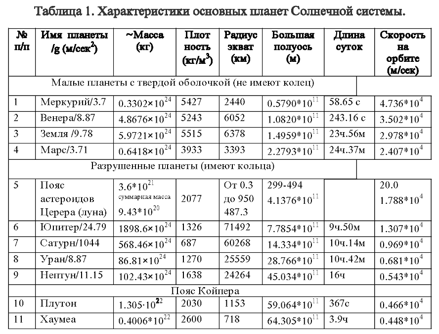 В таблице 1 даны приблизительные значения некоторых характеристик основных планет СС. Пояс астероидов (разрушенную планету Фаэтон) в таблице представляет, сохранившаяся целой, её луна Церера. Пояс Койпера, мало изученный, представляют две его карликовые планеты Плутон и Хаумеа, так как по остальным объектам недостаточно информации для расчета.