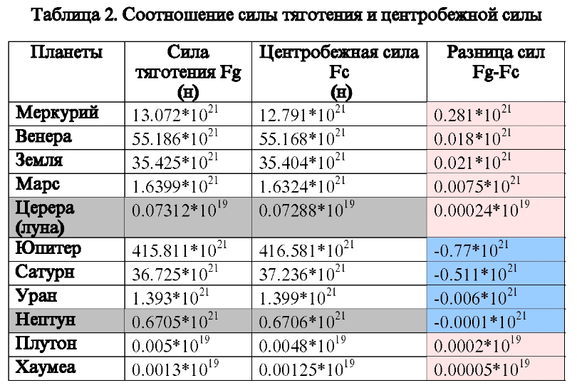 В таблице 2 приведены результаты расчета силы тяготения и центробежной силы для 11 планет, в порядке их удаления от Солнца. В третьем столбце дана разница между силой тяготения и центробежной силой. Розовым цветом выделена положительная разница, а синим цветом – отрицательная разница.